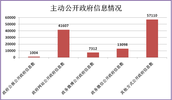 2017年,全市各县区及市政府各部门(直属机构)共主动公开政府信息104522条,其中主动公开规范性文件2005件。通过政府公报公开政府信息1004条;通过网站公开政府信息41607条;通过政务微博公开政府信息7312条;通过政务微信公开政府信息13098条,通过其他方式公开政府信息57110条。