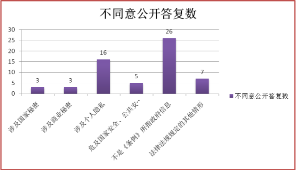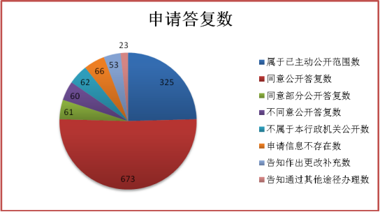 2017年共收到政府信息公开申请1323件,已答复申请1323件。其中,已主动公开325件;同意公开答复673件;同意部分公开答复61件;不同意公开答复60件(其中,涉及国家秘密3件,涉及商业秘密3件,涉及个人隐私16件,危机国家安全、公共安全、经济安全和社会稳定5件,不是《条例》所指政府信息26件,法律法规规定的其他情形7件);不属于本机关公开62件;申请信息不存在66件;告知作出更改补充53件;告知通过其他途径办理23件。