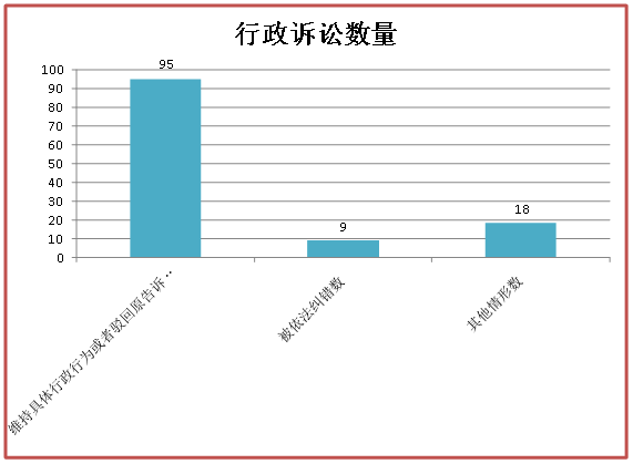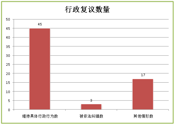 2017年,共收到行政复议申请65件,其中:维持具体行政行为45件,被依法纠错3件,其他情形17件。行政诉讼122件,其中: