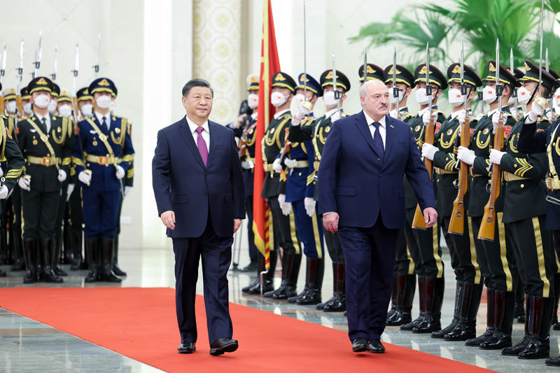 3月1日,国家主席习近平在北京人民大会堂同来华进行国事访问的白俄罗斯总统卢卡申科举行会谈。这是会谈前,习近平在人民大会堂北大厅为卢卡申科举行欢迎仪式。新华社记者 翟健岚 摄